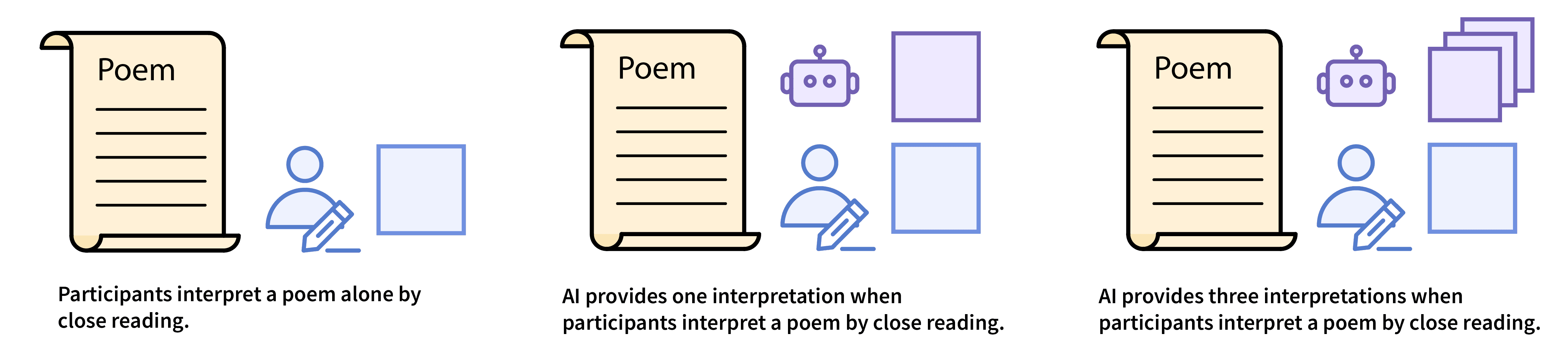 We ran a randomized experiment with 400 crowdworkers as lay readers, each randomly assigned to one of three conditions. In the Control condition (left in the figure below), no AI assistance was provided. In the AI-Single condition (center in the figure below), one AI-generated interpretation was shown alongside the poem. In the AI-Multiple condition (right in the figure below), three AI-generated interpretations were provided, stacked on top of each other, with one visible by default and two more signaled by buttons.